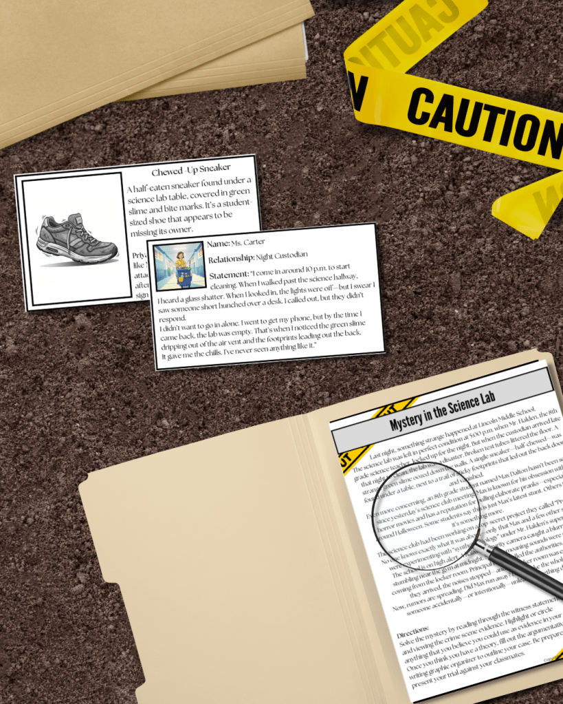 For example, we were working on our argumentative unit. The kids were complaining about when they would ever have to use this in the real world (ugh). So I explained to them a variety of situations when they would need argumentative skills. “What if you want to become a lawyer? Or a journalist? Or a crime scene investigator.” When they left, I began scouring the web again. This time, looking for some real world type of activity that would help them see the importance of this topic, while still practicing the standards. I specifically wanted to see if I could find some sort of “crime scene investigation” because I knew they liked creepy stuff. While I did find crime scene investigations, I found that they were all very elementary. They all seemed to focus on animal characters or light-hearted “crimes.” Not that I wanted something too graphic… but gaining the attention of an 8th grader is not an easy feat…